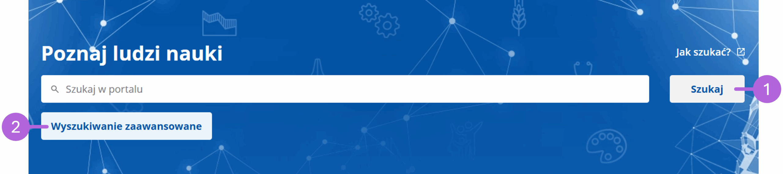 W serwisie Ludzie Nauki możesz szybko i wygodnie znaleźć informacje o naukowcach pracujących w polskich instytucjach. Do dyspozycji masz dwa tryby wyszukiwania: prosty (1) i zaawansowany(2).